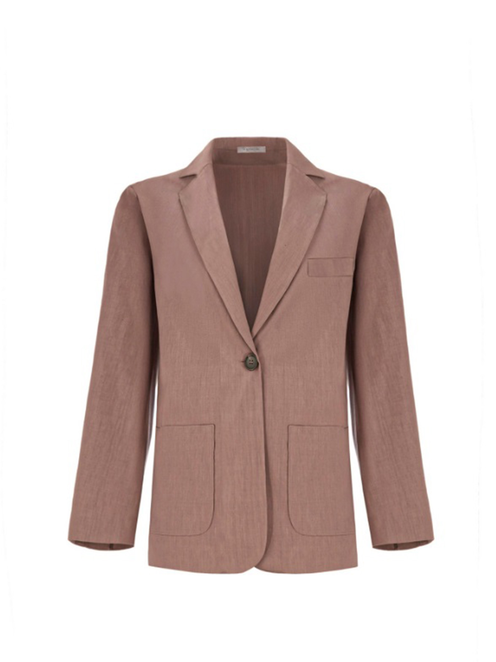 Il revers sportivo che si apre ampio sul decolleté si chiude con un bottone di corno scuro dove il taglio della giacca scende dritto e leggero. Taschino obliquo sul petto e tasche stondate sotto alla vita