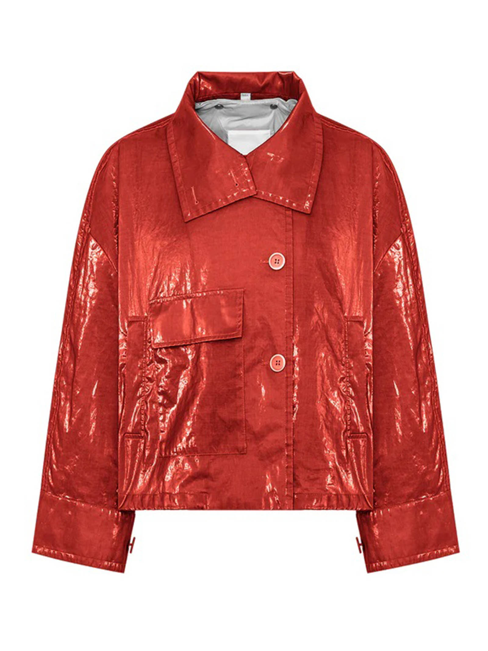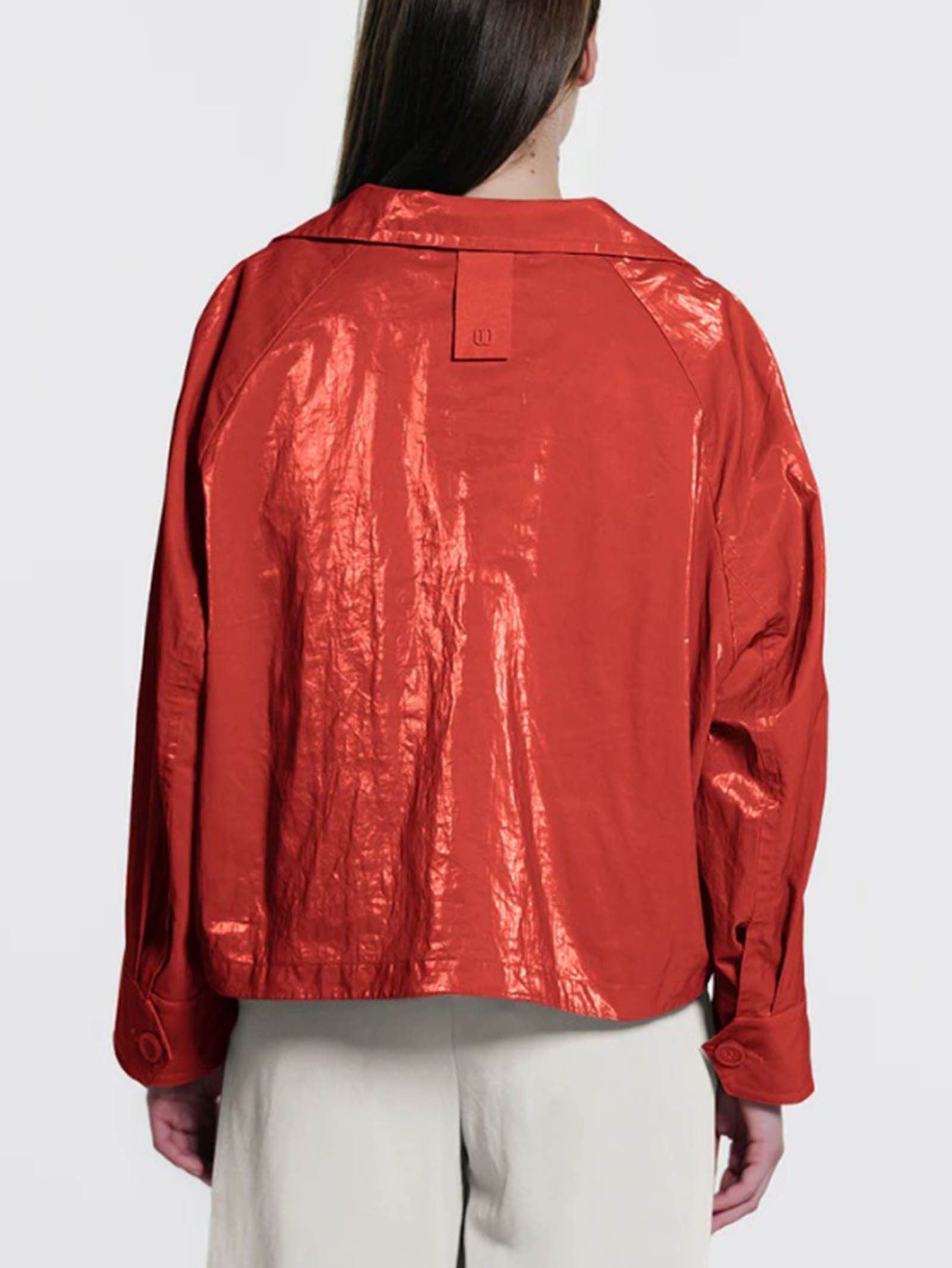 • Giacca doppio petto oversize in tessuto ramiè con spalmatura superficiale (mano gommata)