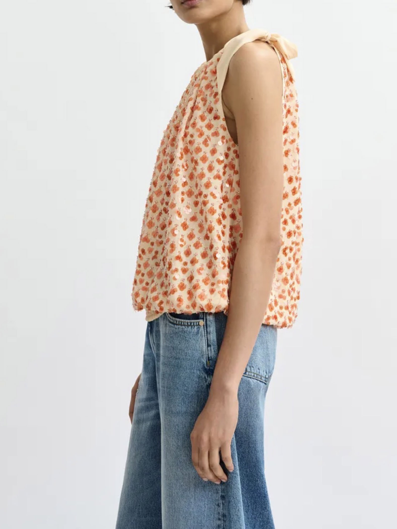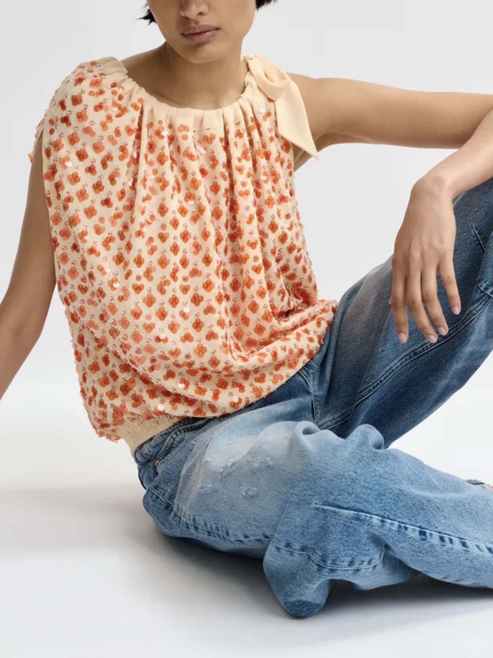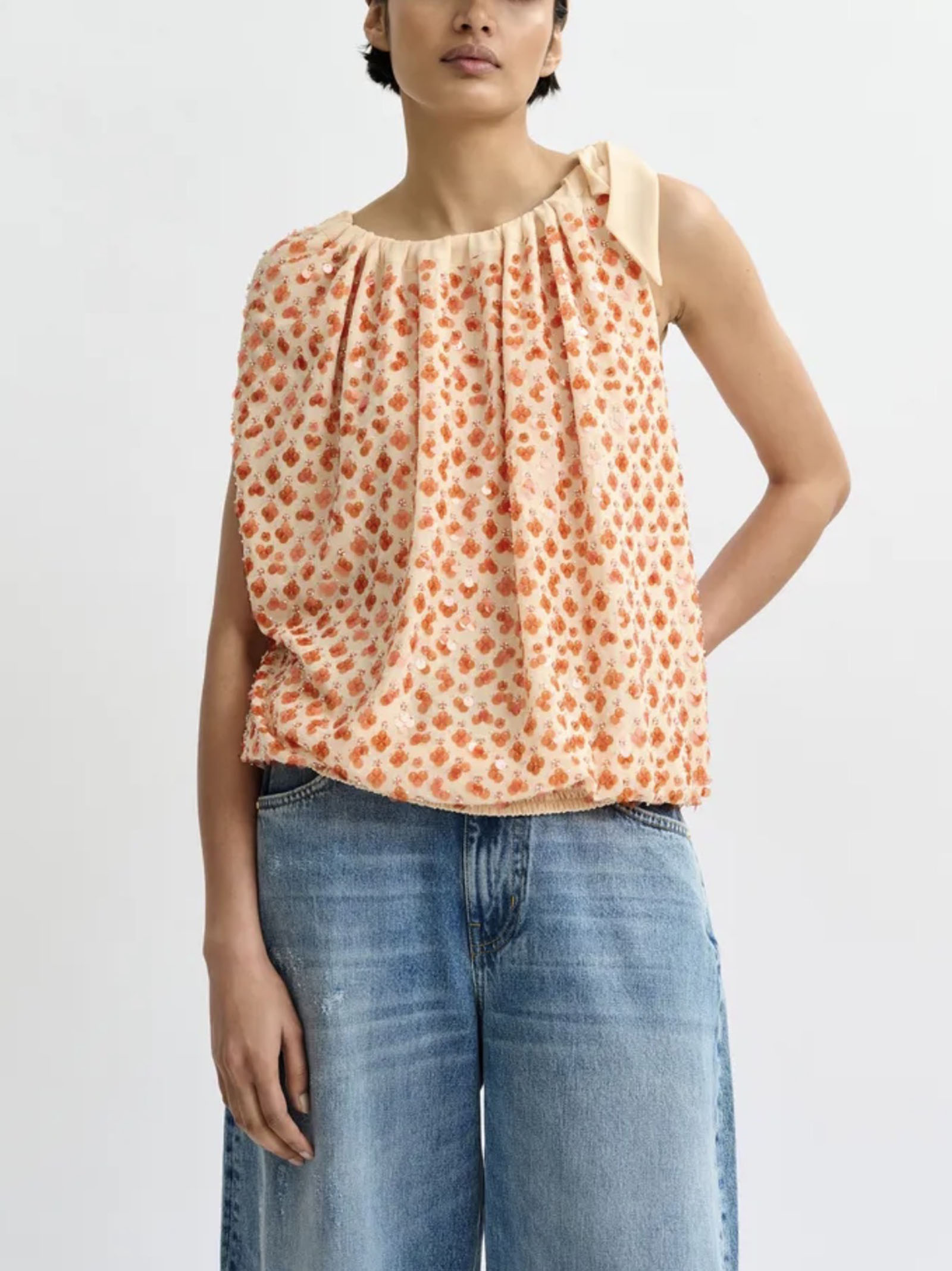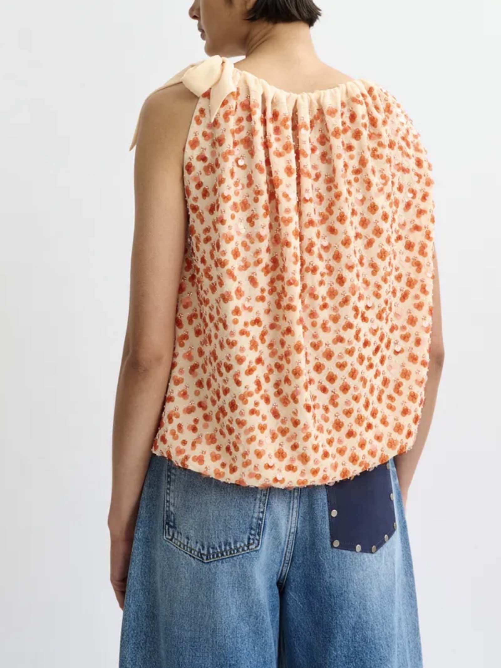 Top asimmetrico arancione impreziosito da paillettes con nastro da annodare al collo