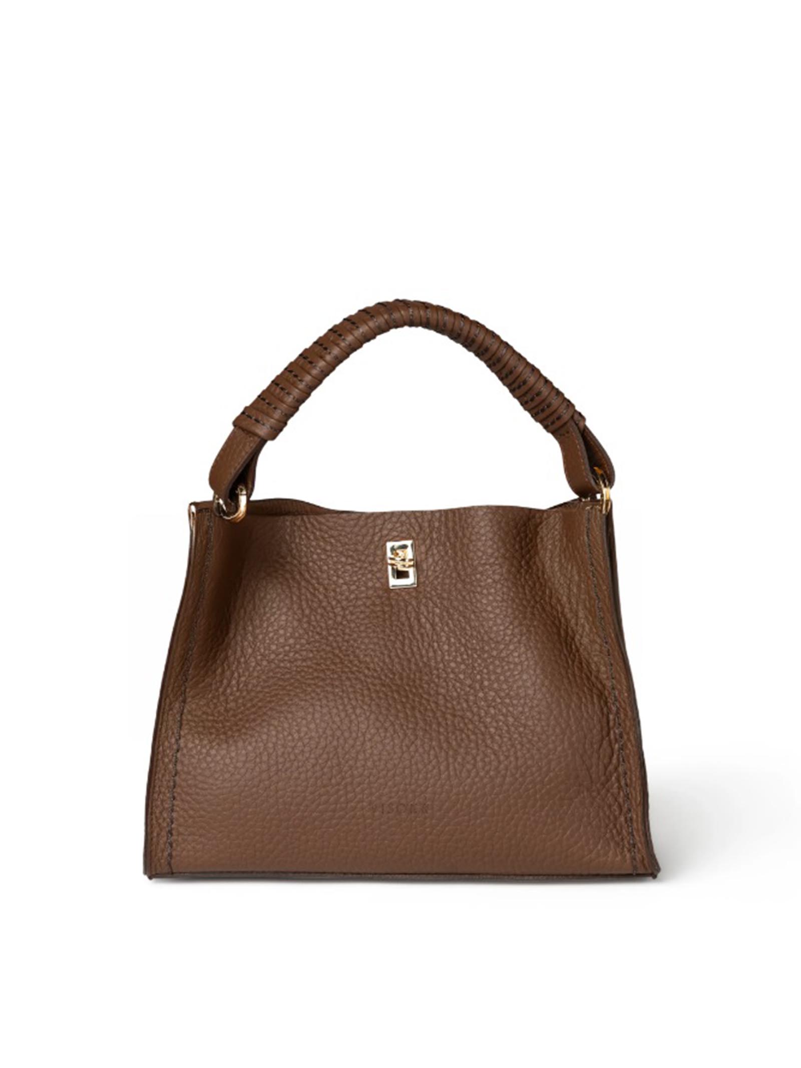 Borsa realizzata in pelle di vitello, ha la tracolla regolabile e removibile, il manico intrecciato in pelle e la chiusura girevole